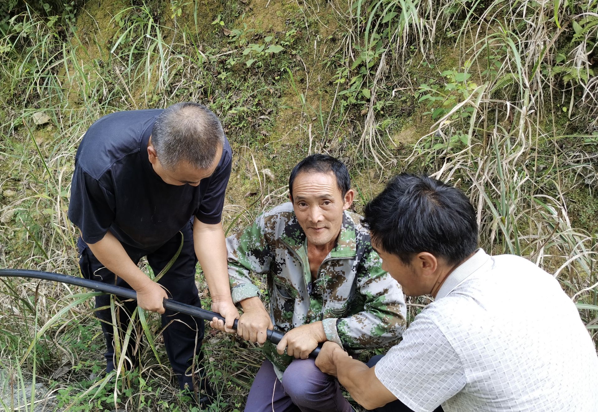 连续数月的干旱,让保障村民正常用水成为了工作队民警的头等大事,也是一大难题。驻村工作队民警与村民一起上山四处寻找水源,终于在深山中找到了可用的山泉水。由于水源距离村民家中较远,又位于半山腰上,人员通行都很困难,车辆更无法通行,工作队员们与村民背着一卷卷水管步行上山,顺着山势架设水管近4000米引水下山。