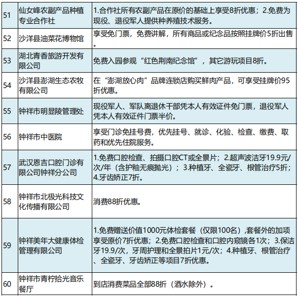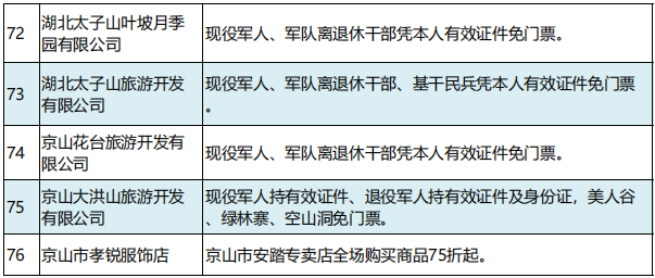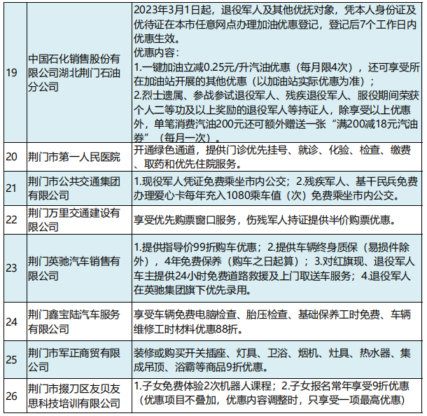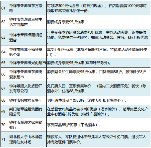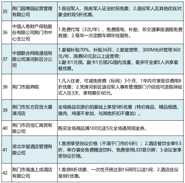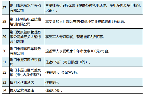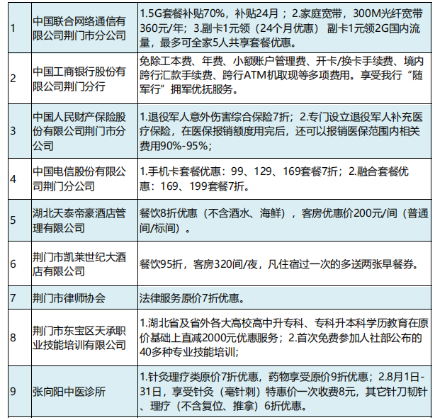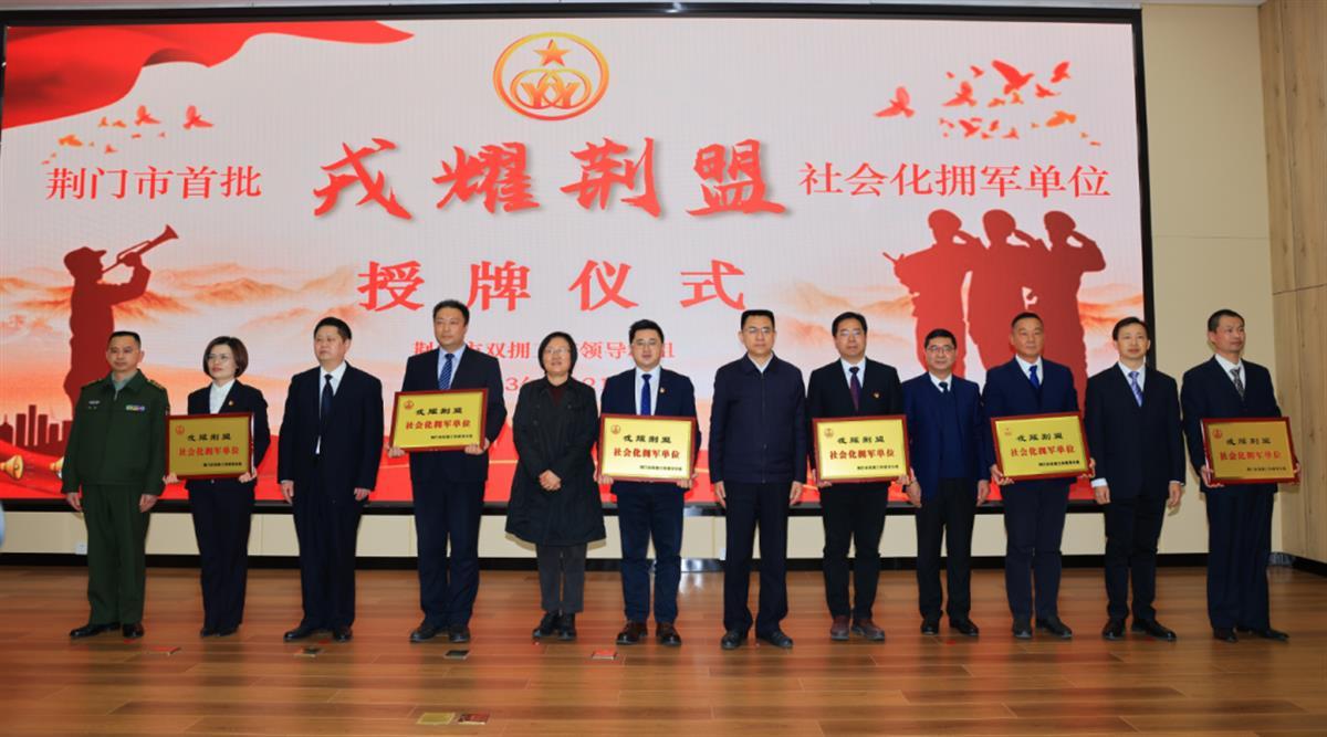 2月21日,湖北省荆门市举办“戎耀荆盟”社会化拥军单位授牌仪式。首批76家企业(单位)为现役军人、退役军人和其他优抚对象提供优待服务。现役军人凭有效证件(包括军官证、文职干部证、士官证、义务兵证等),退役军人和其他优抚对象凭“优待证”,即可在“戎耀荆盟”商家消费时享受商品优惠、服务优待和其他尊享服务。