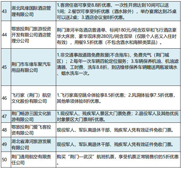 2022年7月8日,荆门市双拥办面向社会发布《荆门市首批“戎耀荆盟”社会化拥军服务平台招募公告》,经过企业自主申报,市双拥办初审,市公安局、市市场监管局、市税务局等部门联合复审以及集中公示等程序后,首批共有76家企业(单位)正式纳入“戎耀荆盟”拥军平台,涵盖通讯、医疗、商超、保险、旅游、餐饮酒店、培训、生活服务等8大民生领域,提供优惠清单128条,行业优惠力度在5至9折不等,部分行业还提供免费服务项目、专属服务项目以及面值不等的代金券。各项优惠政策呈现“普惠、优质、多样化”的特点。