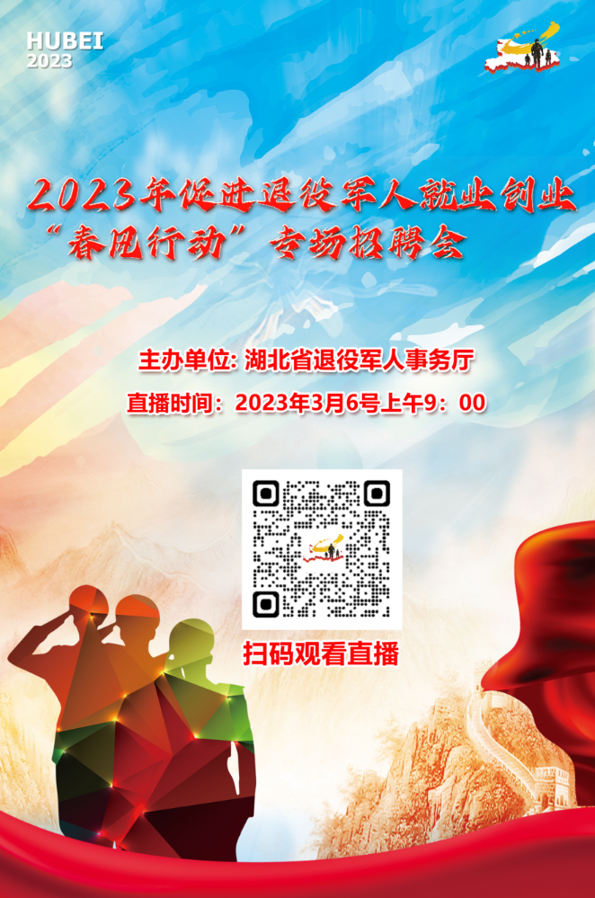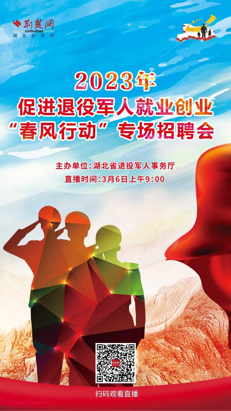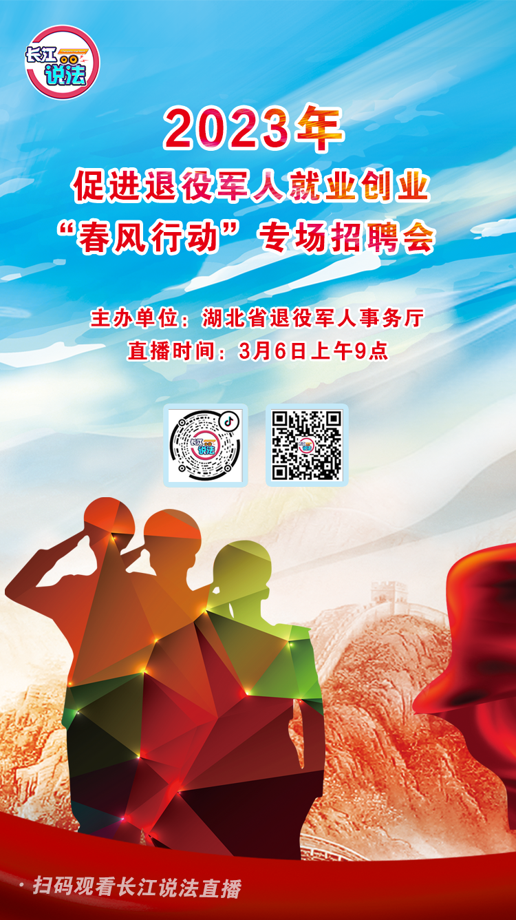 3月6日(明日)9时,湖北省2023年促进退役军人就业创业“春风行动”专场招聘活动启动。活动将通过湖北广电、荆楚网、武汉方阵全程直播,直播间设置“企业带岗”环节,战友们可提前挑选心仪岗位,直播间内与企业负责人互动交流。