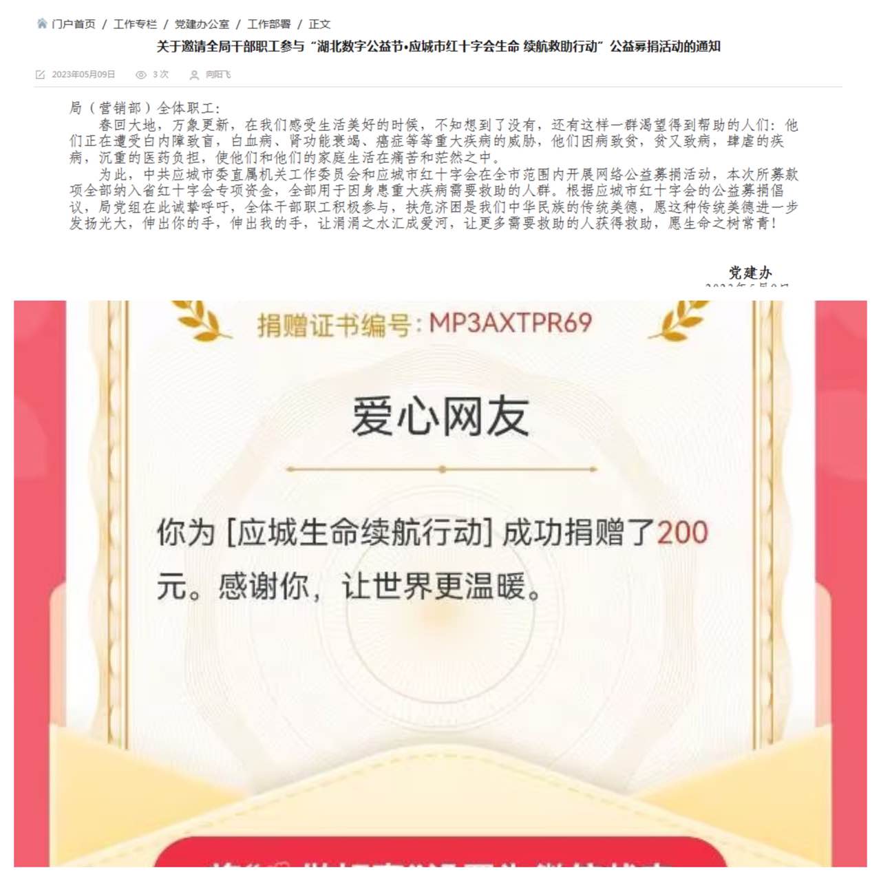 荆楚网(湖北日报网)讯(通讯员万红)近日,中共应城市委直属机关工作委员会和应城市红十字会在全市范围内开展网络公益募捐活动,应城市烟草专卖局积极主动响应,局党组及时部署该募捐工作,在局OA内网下发通知,并利用工作群广泛发动全体干部职工积极参与,呼吁全体干部职工伸出援手,帮助因身患重大疾病需要救助的人群。