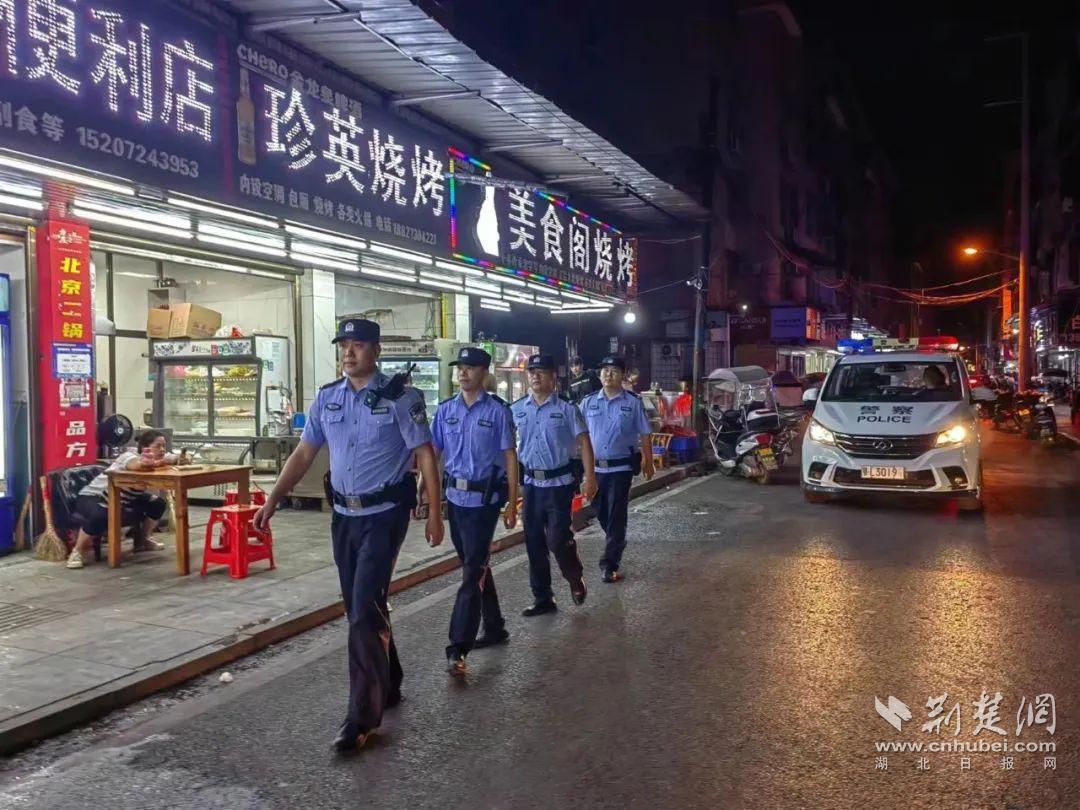 7月1日晚,在孝感市“小吃一条街”玉泉南路,一辆警车停在街头闪着警灯,3名公安民警辅警正在徒步巡逻。