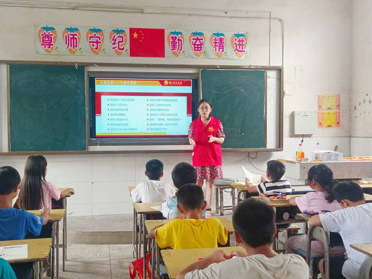 党的历史是最生动、最有说服力的教科书,它全面记载了党带领全国人民进行革命、建设、改革和发展的历程,蕴含了持久深厚的奋斗力量。课堂上,小分队指导老师以《扎实开展主题教育 为奋进新征程凝心聚力》为主题,从筑牢信仰之基;深化理想,校准价值航向、补足信仰之钙;内化观念,永葆政治本色、把稳思想之舵;转化能力,掌握学习主动、知信行结合,推动主题教育学习深入推进四个方面,结合自身的工作思考,为学生们讲授了一堂生动的党课。课间,孩子们若有所思,或紧闭双唇,或目光坚定,仿佛看到他们心底希望的种子,正在悄悄生长。