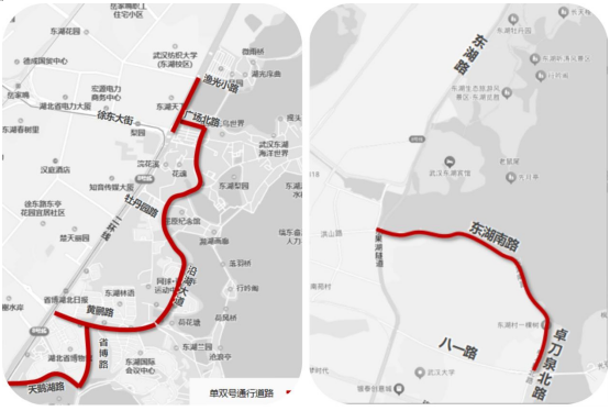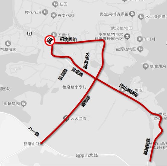 鲁磨路(八一路至樱花园大门)、团山路辅道(喻家湖路 至团山路)、植物园路(鲁磨路至团山路)、东湖南路(洪山路至卓刀泉北路)、卓刀泉北路(东湖南路)。