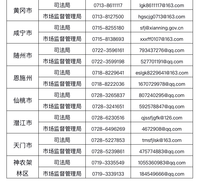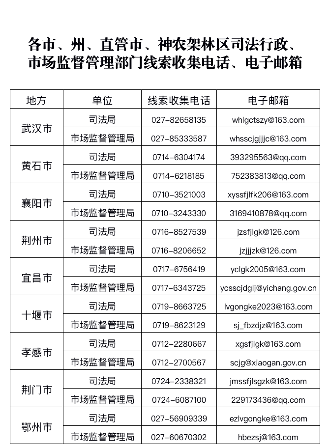 (二)电子邮箱。可将问题线索发送至各市、州、直管市、神农架林区司法局、市场监督管理局电子邮箱(邮件主题请注明“问题线索”)。