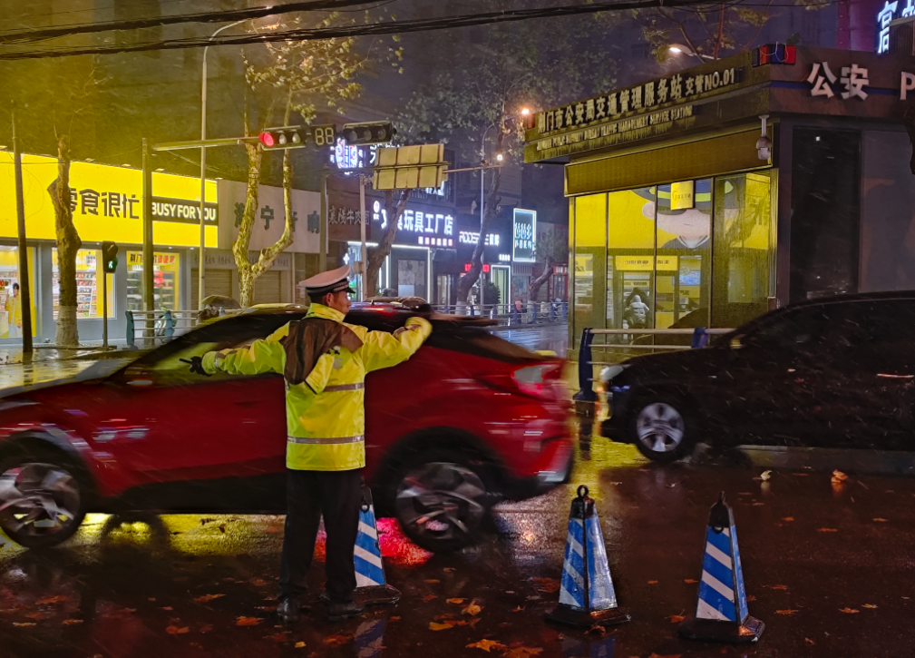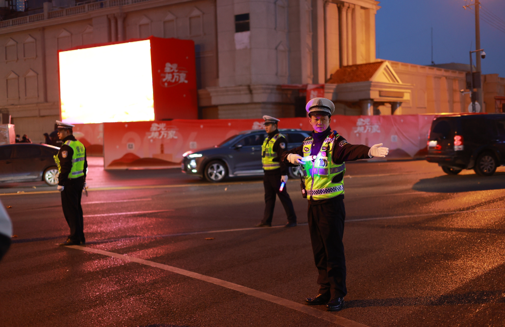 ▲ 武汉交警在跨年夜庆典活动开始前指挥过往车辆有序通行