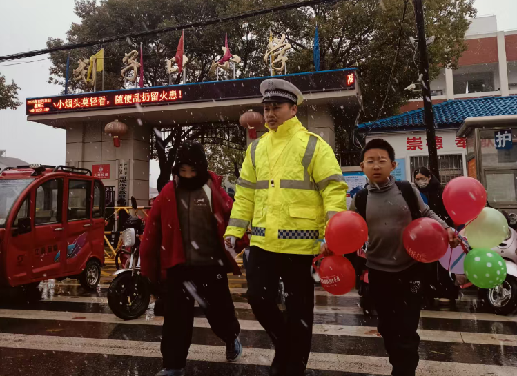 ▲ 荆门交警在划子口小学路段开展雪中护校工作