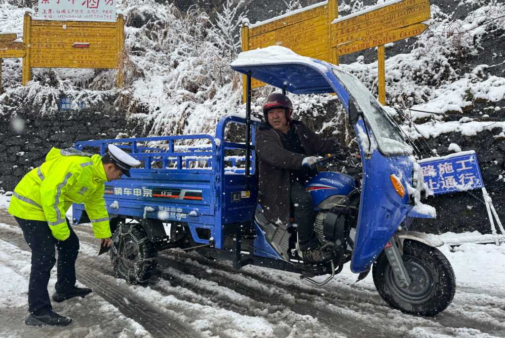▲ 恩施交警帮助驾驶人安装防滑链