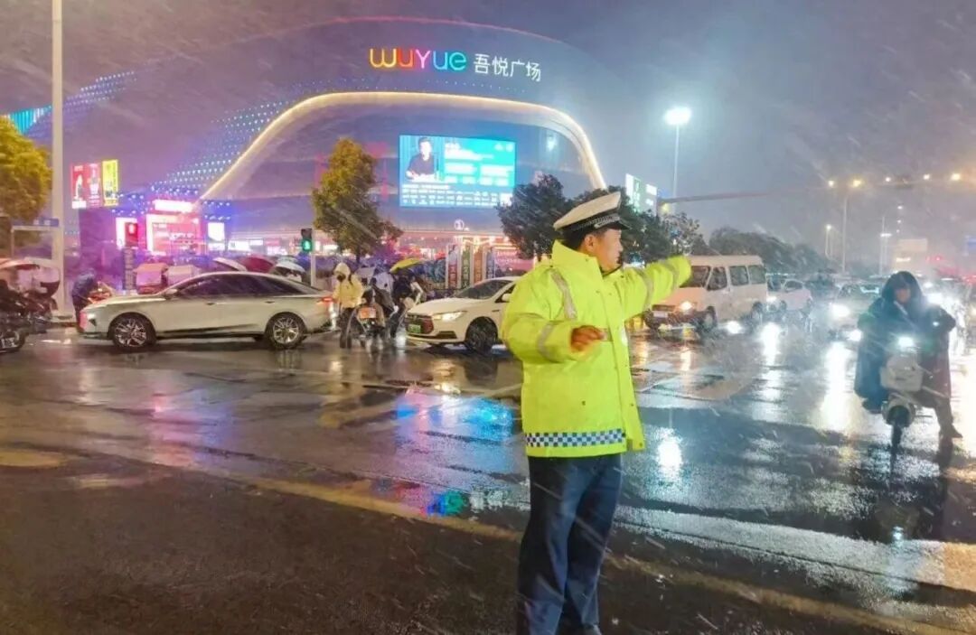▲ 随州交警在吾悦广场“跨年狂欢夜”活动现场指挥疏导交通