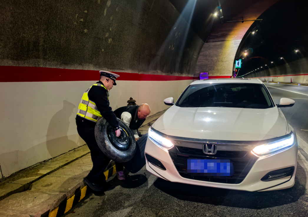 ▲ 高警五支队民警在沪蓉高速隧道停车港湾内帮助驾驶人为故障车辆更换备胎