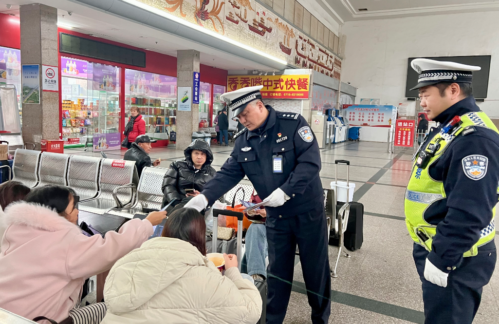 ▲ 荆州交警深入长途客运站,现场向驾驶人、乘客宣讲交通安全知识
