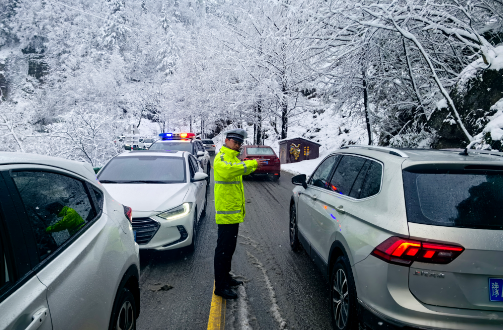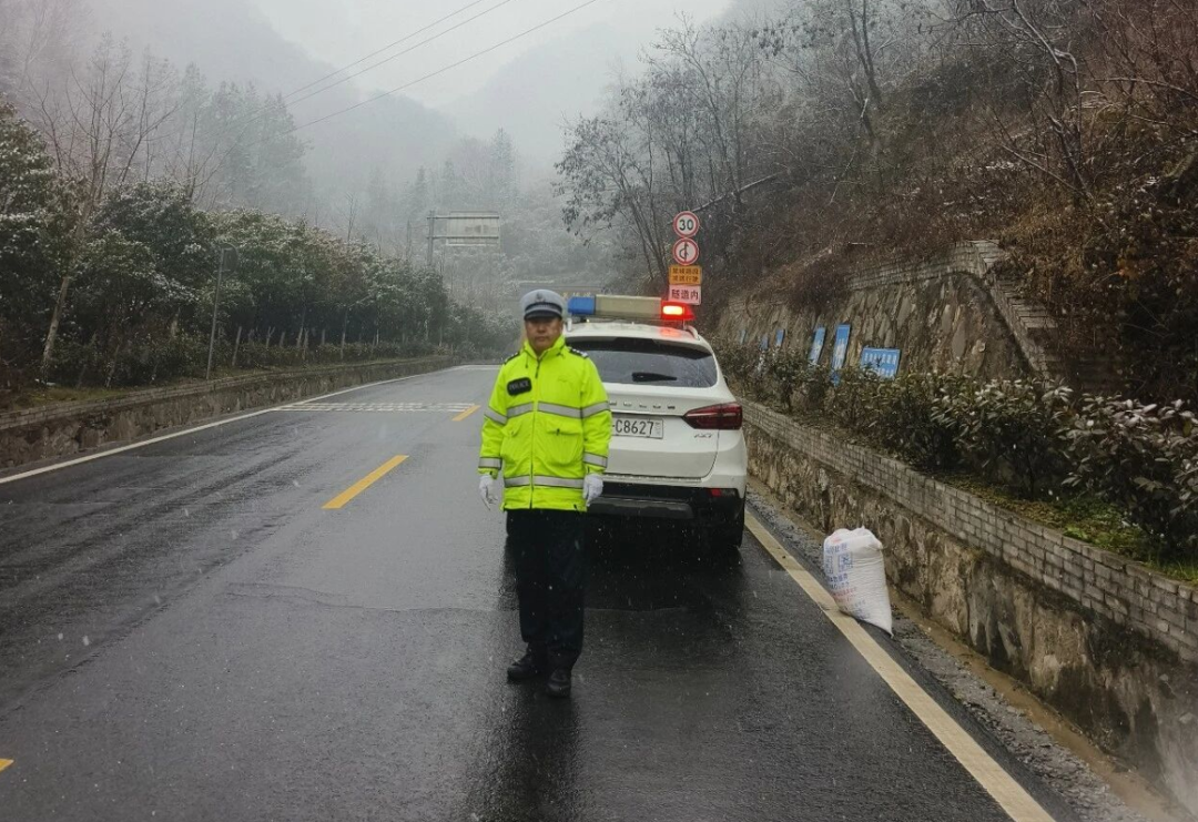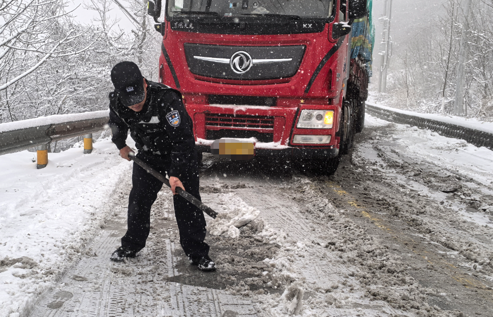 ▲ 恩施交警增派警力到积雪路面,铲冰除雪保障车辆顺利通行
