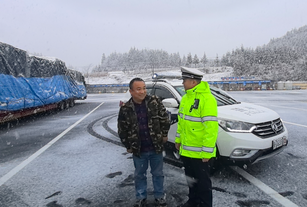 ▲ 恩施交警为过往车辆驾驶人讲解冰雪天行车注意事项
