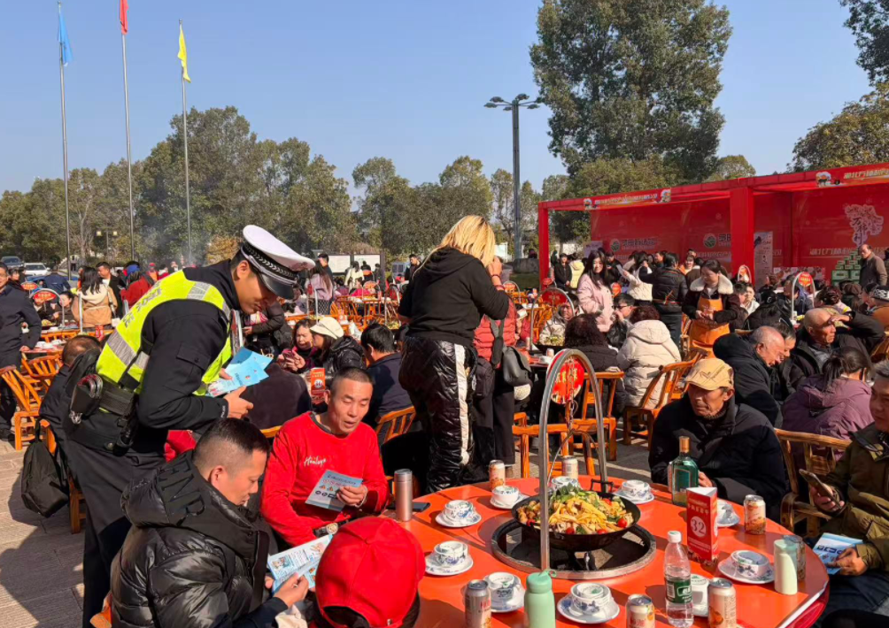 ▲ 黄冈交警在罗田吊锅节现场宣讲交通安全知识,并发放冬季安全出行知识手册