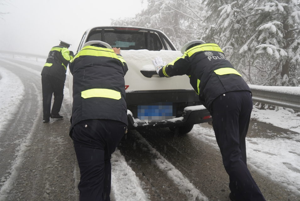 ▲ 十堰交警在大川路积雪路段帮助受困车辆脱困