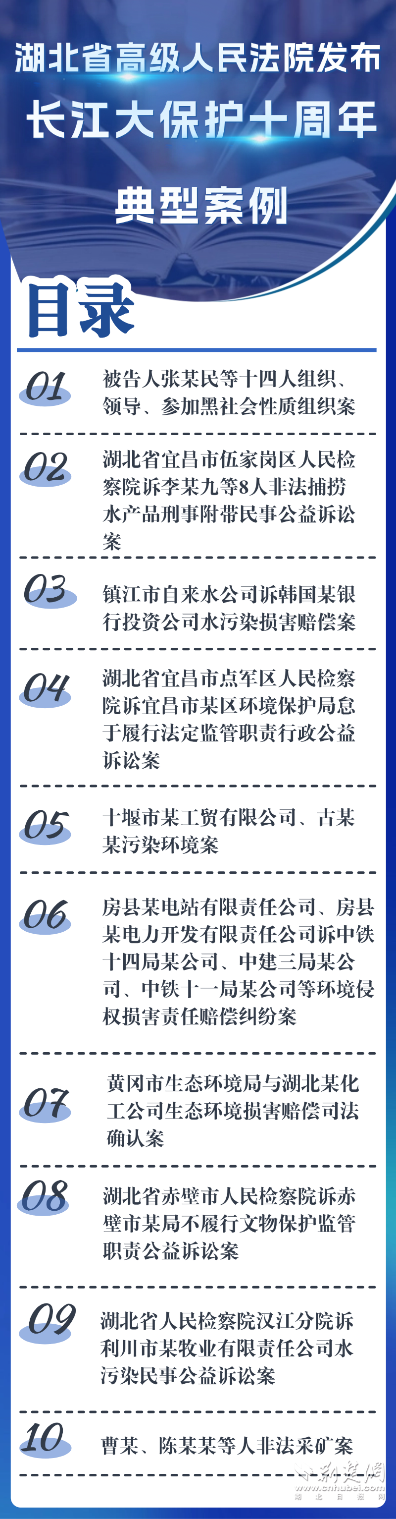 值此重要节点,湖北省高级人民法院梳理10年来审判成果,精选发布10个典型案例,涵盖长江干支流刑事、民事、行政、公益诉讼等多个司法实践领域,集中展现了湖北法院通过打击非法采砂、非法捕捞,惩治水污染违法犯罪等,推动长江大保护和服务保障长江经济带高质量发展的担当作为。