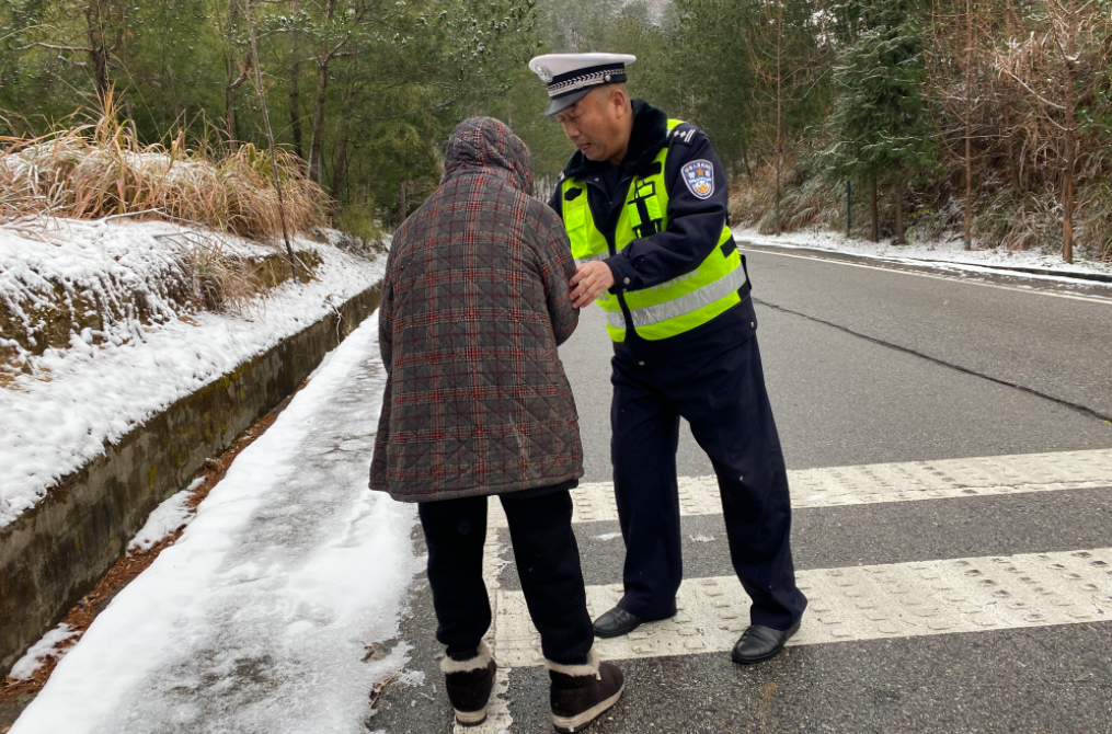 ▲黄冈交警在结冰路段引导老人安全通行。