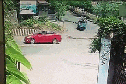 一辆三轮车与一辆快速行驶的轿车同时进入路口,两车发生猛烈撞击,三轮车上的三人瞬间被撞飞,后面搭载两人的头部率先着地,骑车人被轿车推行数米后才停止,致使身体多处受伤。