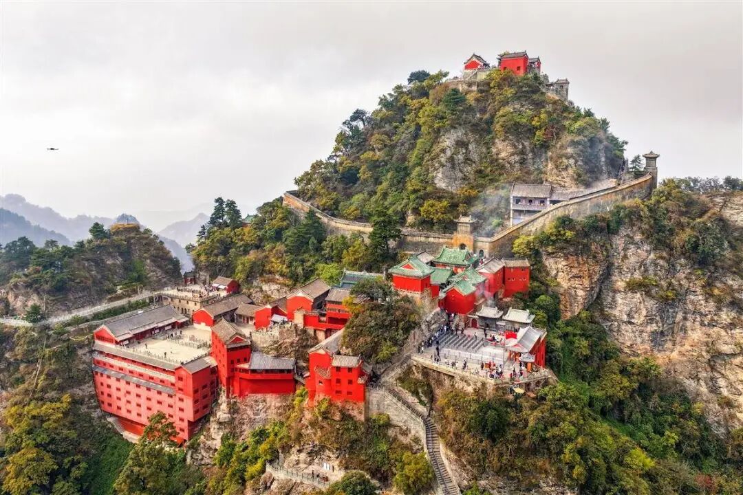 在武当山顶,从早春的薄雾里看红墙碧瓦与远山含黛相映。