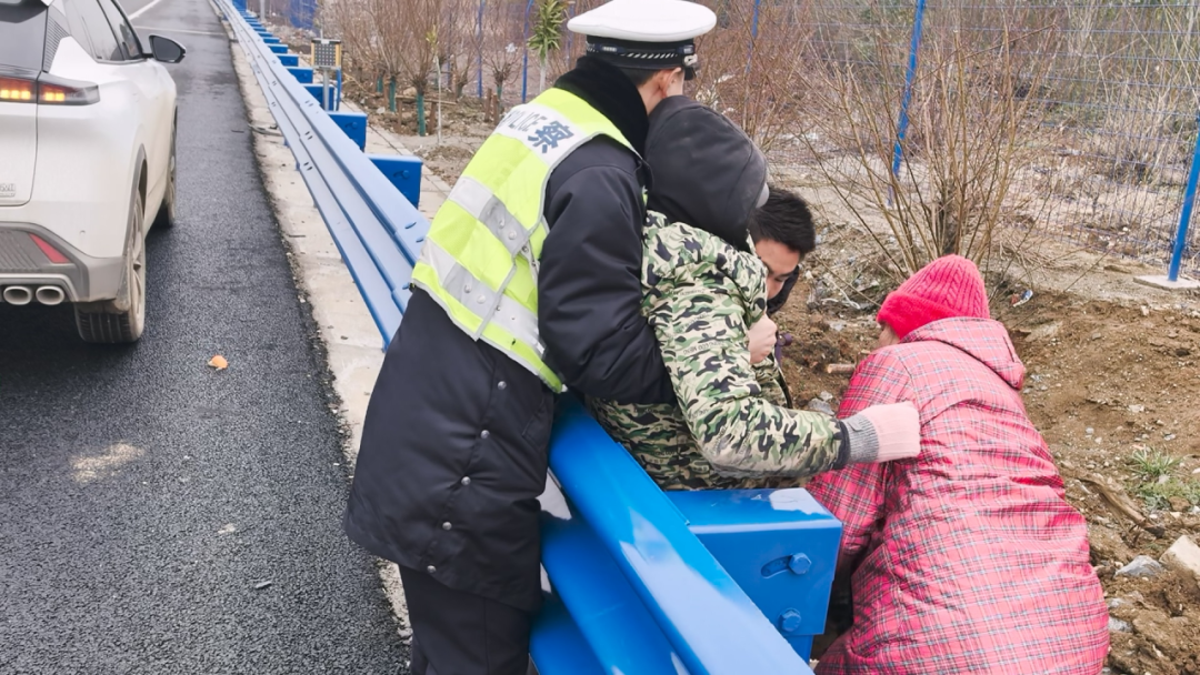 下午两点多,对讲机响了。桃花驿收费站附近,有辆车打双闪停在应急车道,护栏外站着三个人,来回跺脚。李天峰赶过去一问,才知道这家的老爷子九十多了,走丢了刚找着,但路边护栏有一米多高,老人过不来。