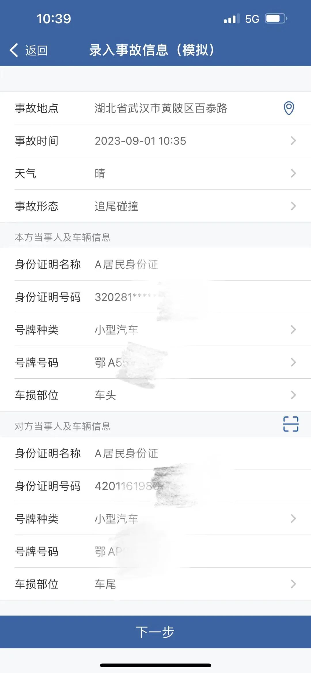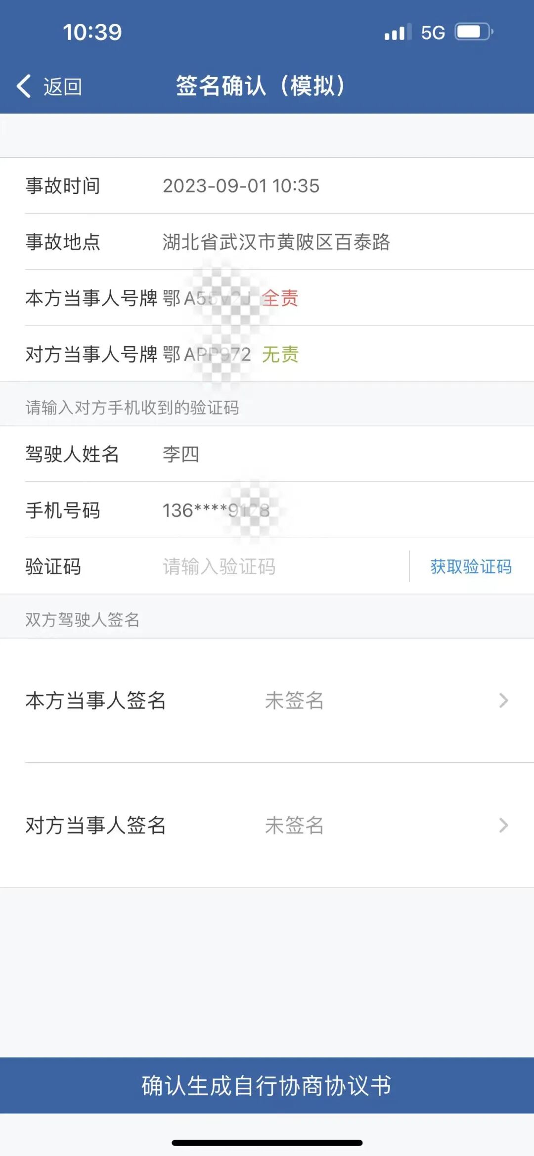 根据页面引导,录入相关事故信息。签名确认后会收到短信验证码,双方驾驶人无异议后签名即事故处理完毕,后台审核后生成电子版道路交通事故自行协商协议书,向保险公司进行理赔即可。